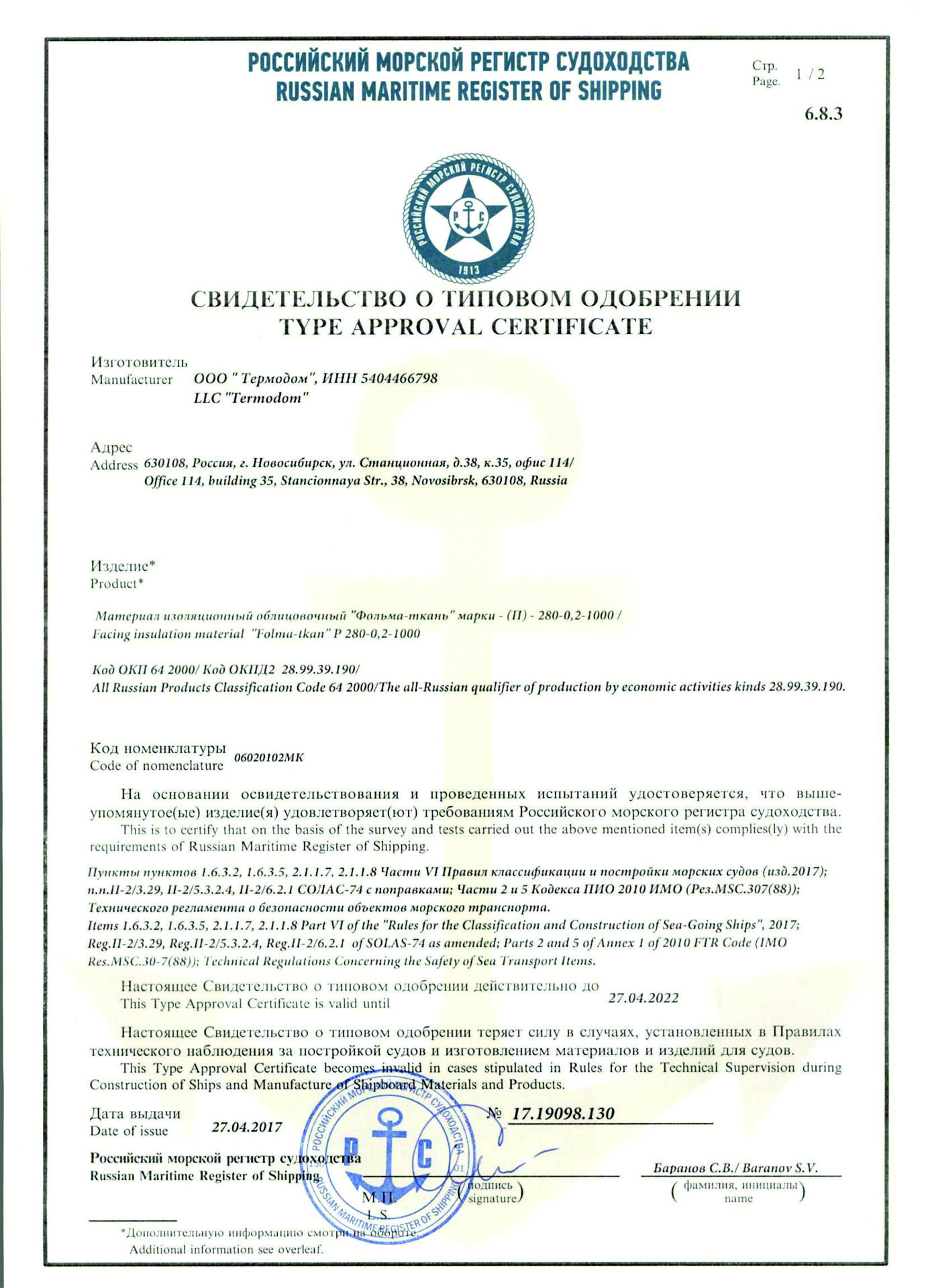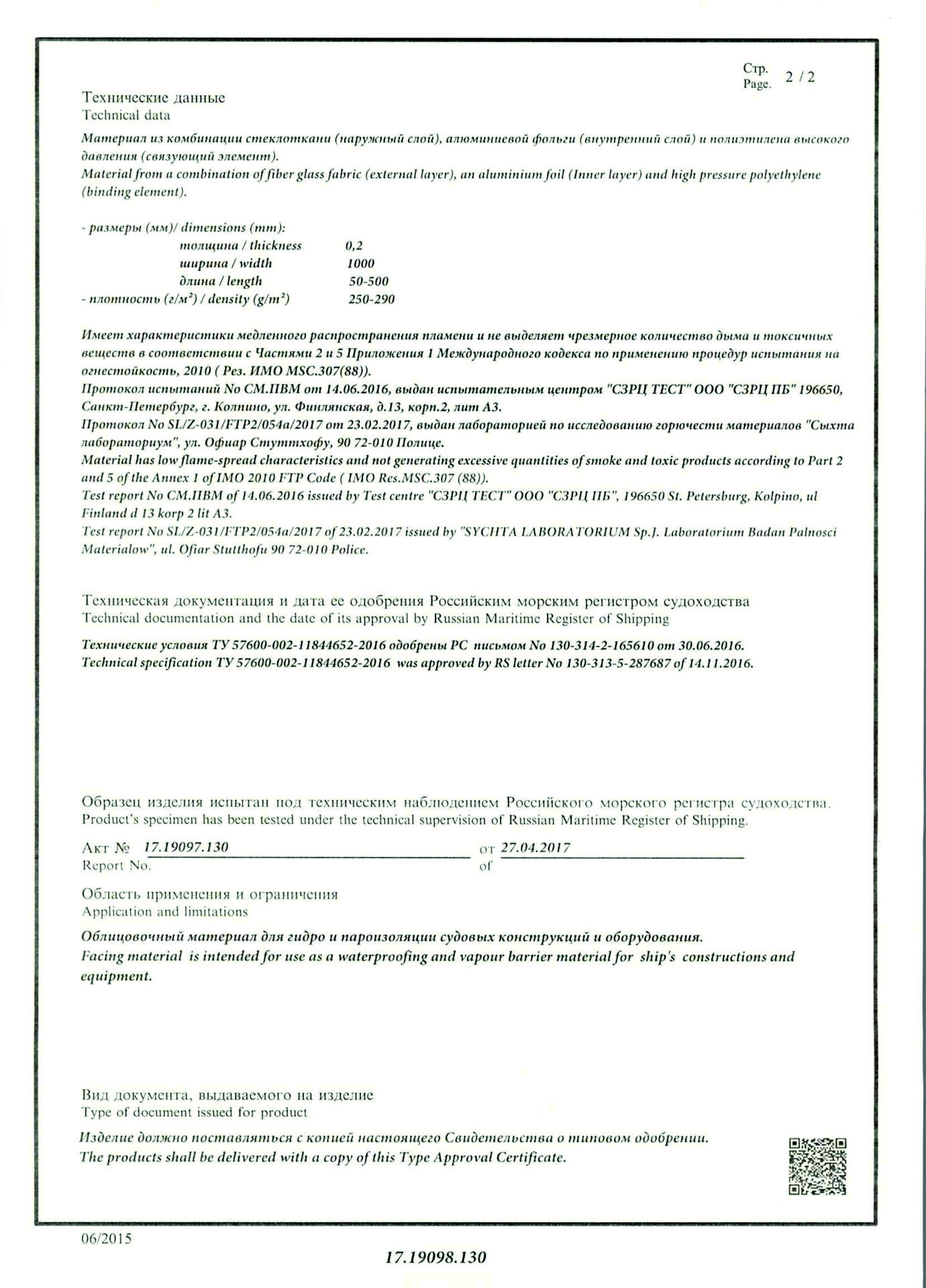 Результат - проведены испытания в Испытательном центре СЗРЦ ТЕСТ ООО "СЗРЦ ПБ", получен протокол испытаний, подтверждены характеристики материала "Foilglass Фольма-ткань П-280". В результате испытаний образец не изменил своих характеристик, успешно применяется по настоящее время при монтаже изоляции корпусных конструкций на Атомном ледоколе "Арктика". Подписываются договоры на всю серию ледоколов.